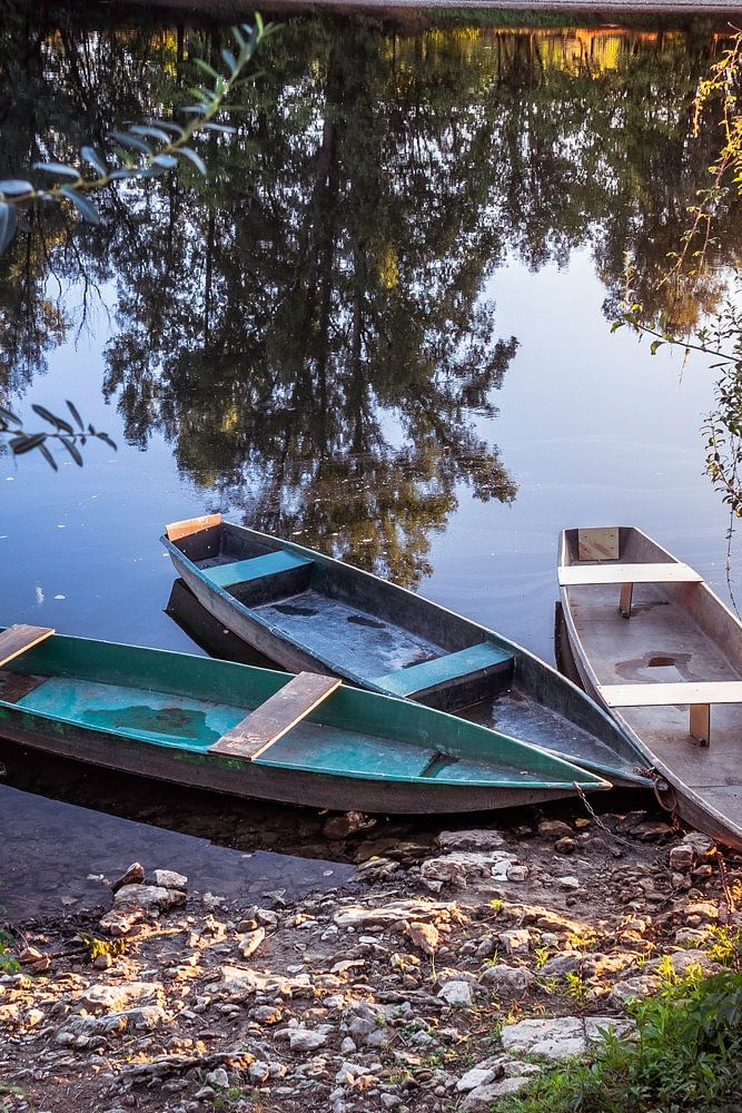 Trois bateaux en bois gisent dans l'eau de la rivière Dordogne en France, à la lumière du soir.