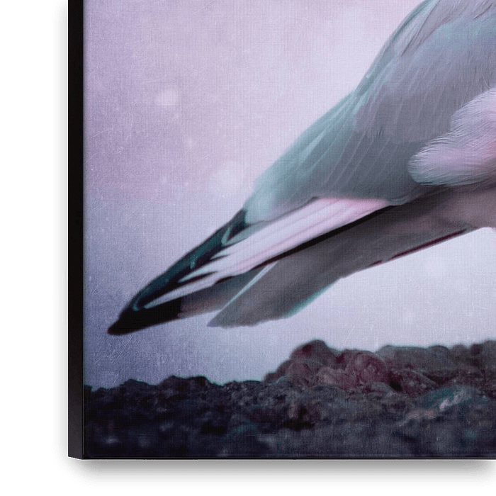 Close-up van een witte meeuw op het strand - bewerkt met texturen en afgezwakt in roze en blauwe tinten