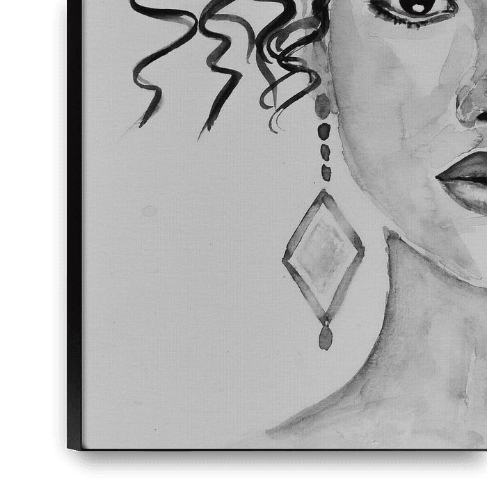 Aquarelle d'une belle femme en noir et blanc avec des cheveux noirs, un bandeau et des boucles d'oreilles. S'adapte à différents intérieurs et tendances,