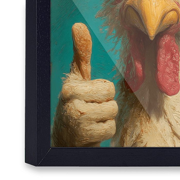 Une poule richement illustrée regarde le spectateur avec un regard perçant, presque provocateur. Les yeux sont grands ouverts, les pupilles sont bien focalisées, le bec est légèrement ouvert - l'expression d'une pure détermination. D'une main plumeuse, la poule montre le "pouce levé". Les couleurs vives - surtout le rouge vif de la…