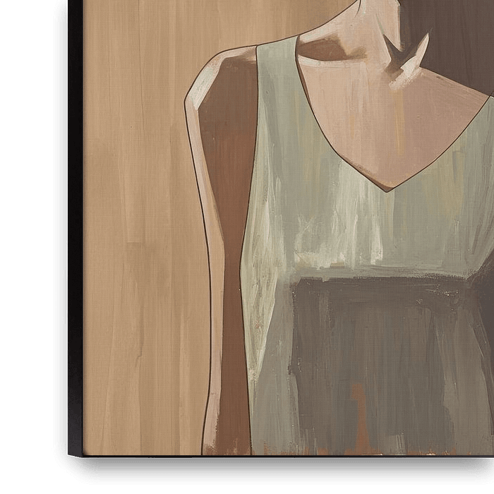 Aura d'automne - Ce tableau pour femmes représente une femme anonyme dont la tête est dissimulée sous une voûte luxuriante et colorée rappelant fortement un arbre rempli de feuilles d'automne, accentuée par des nuances de jaune, d'orange et de vert sur un fond de bois doux.