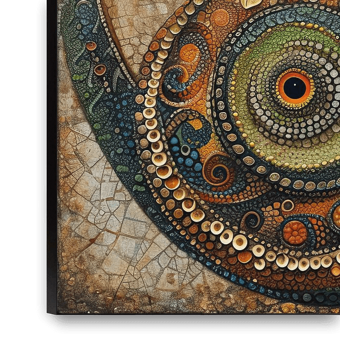 Vivid Camouflage - Cette peinture de caméléon offre une représentation hypnotique d'un caméléon prenant une position circulaire avec sa queue, peinte avec des détails flamboyants, presque surréalistes, en mettant l'accent sur les motifs et les couleurs. La peau du caméléon est une mosaïque de couleurs brillantes et de dizaines de motifs circulaires et en spirale qui se chevauchent et s'entrelacent. L'orange, le vert, le jaune, le rouge et le bronze occupent une place prépondérante, chacun d'entre eux mettant en valeur les courbes et les angles du corps et lui conférant une texture vibrante, presque hypnotique. L'œil du caméléon, grand et expressif, agit comme un point focal dans le tableau, entouré d'anneaux de couleurs contrastées qui ajoutent de l'intensité. L'arrière-plan a une teinte beige craquelée qui donne l'illusion d'une altération antique, contrastant ainsi avec les couleurs vibrantes du caméléon, mais les complétant également.