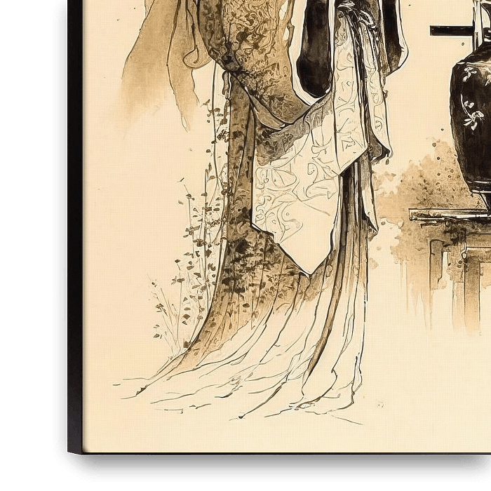 Reproduction d'une aquarelle représentant une Geisha japonaise pendant une cérémonie du thé. Une geisha est une hôtesse professionnelle qui divertit les invités par des chansons, des danses et des conversations lors des dîners japonais. La cérémonie du thé est importante dans la culture japonaise et est associée à la paix, à l'harmonie et à l'hospitalité. Lors des rassemblements, la geisha devait préparer et servir le thé, où elle pouvait montrer ses talents d'hôtesse. Une cérémonie dure environ quatre heures et comprend également un certain nombre de repas. Avant de pouvoir faire ses débuts en tant que geisha, une femme devait suivre une longue formation. Dès son plus jeune âge, elle allait vivre dans une maison de geisha, où on lui enseignait la musique, la danse, la calligraphie, la poésie et la littérature, entre autres, et où elle apprenait certaines compétences sociales, comme les salutations formelles et les techniques de conversation, afin de pouvoir se mêler à divers invités. En Occident, la geisha était considérée comme une prostituée, mais traditionnellement, le sexe ne fait pas partie de la relation entre la geisha et ses clients. Toutefois, certaines geishas se sont engagées dans des relations à long terme ou ont même épousé un client régulier, qui leur offrait des cadeaux coûteux et prenait en charge leur entretien.