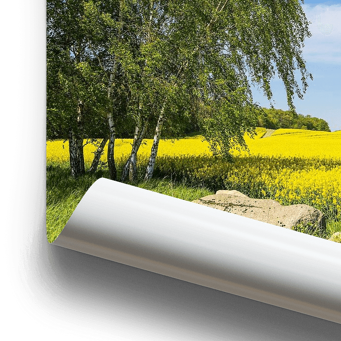 Achetez cette œuvre d'art de paysage Champ de colza avec des arbres et un ciel bleu près de Parkentin par Rico Ködder sur toile, aluminium, ArtFrame ou photographie (encadrée), impression d'art en haute qualité et tout format.