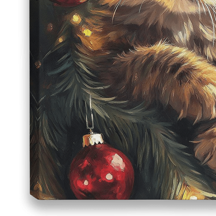 Chat de Noël | Fête de Noël - Cette peinture de Noël montre un chaton mignon et duveteux portant un chapeau de Père Noël, entrelacé dans les branches vertes d'un arbre de Noël, entouré de boules rouges brillantes et de lumières douces et chaudes.