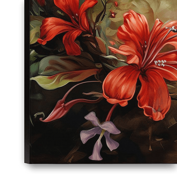 Colibri | Vert - La toile représente un gracieux colibri en vol, cueillant avec élégance le nectar de fleurs d'un rouge flamboyant. Les tons verts et bleus de l'oiseau se détachent sur une palette de couleurs douces à l'arrière-plan, avec des touches de verts et de bruns subtils, qui mettent l'accent sur l'oiseau. La dynamique et les détails des ailes donnent à la peinture un aspect vivant et naturel.