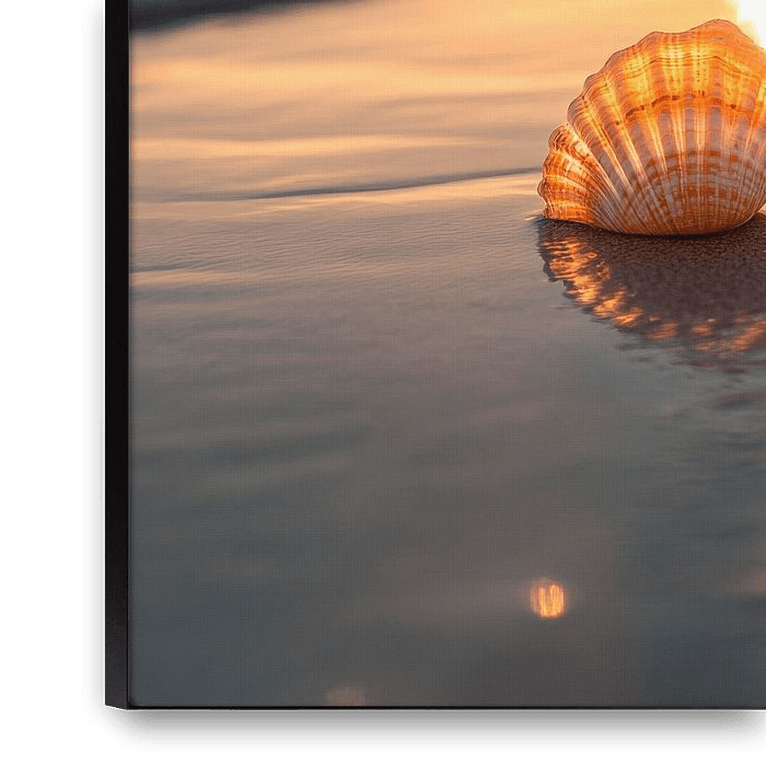 Des vagues douces entourent un coquillage délicat qui scintille dans la lumière dorée du soleil couchant. Son motif filigrane reflète les tons chauds du ciel, tandis que le ressac rafraîchissant raconte en silence des histoires de mer. Un moment de calme, capturé entre ciel et eau, qui rappelle le cœur de l'âme.