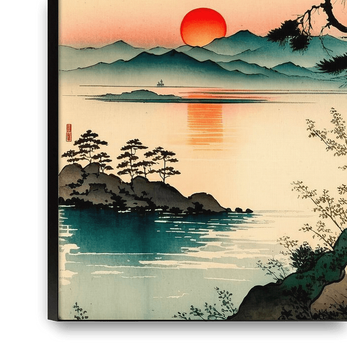 Une aquarelle de la côte ouest du Japon dans un paysage au soleil levant. On y voit des arbres au bord de l'eau et un soleil levant se reflétant dans l'eau calme de la baie. Aquarelle dans le style de la période Edo (1603-1868).
