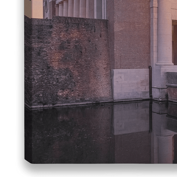 Photo carrée à l'échelle 1:1 d'une soirée au coucher du soleil à la Porte de Menin illuminée à Ypres, ville historique de Flandre occidentale, en Belgique, connue pour son rôle important dans la Première Guerre mondiale.