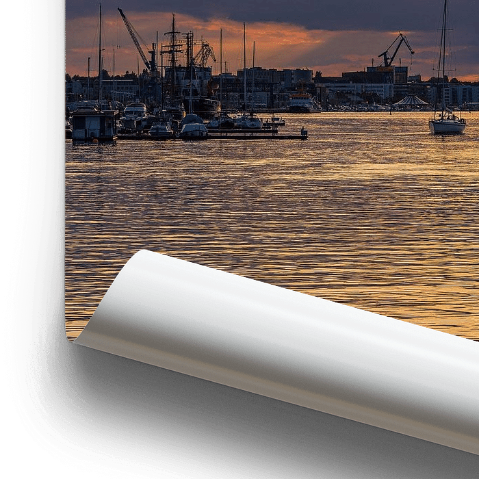 À propos de ‘Coucher de soleil avec des voiliers dans le port de la ville de Rostock’ par Rico Ködder