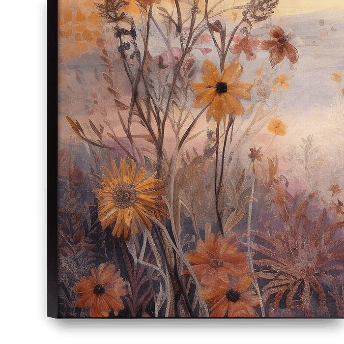 Zebra Sunset - La toile présente une impression de rêve avec un zèbre en son centre sur un fond coloré de tons chauds et une suggestion de soleil couchant. Les fleurs et les textures douces lui donnent un aspect presque éthéré, tandis que les motifs du zèbre offrent un contraste ludique.