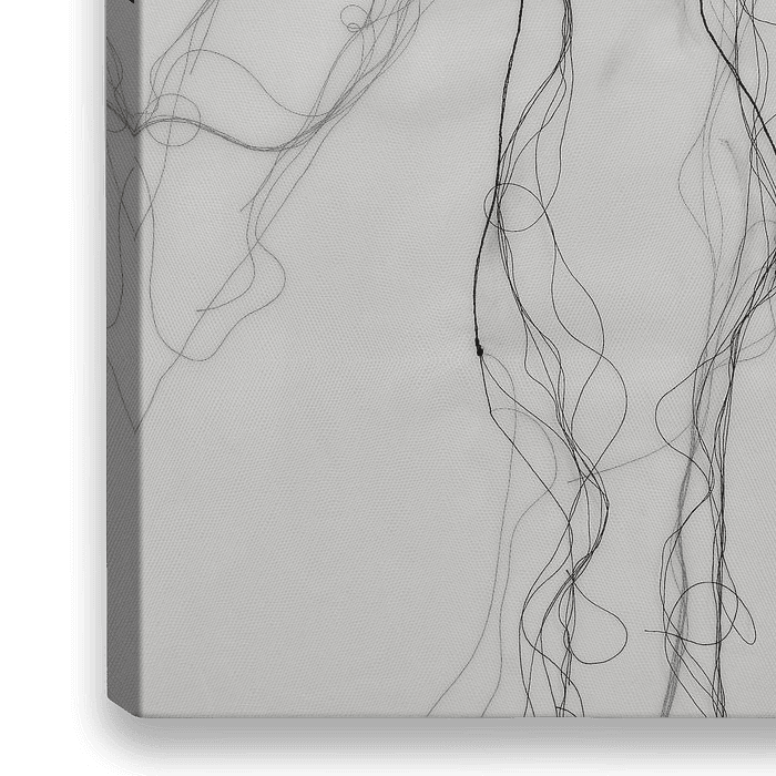 Extrait de la série " Demure ", une œuvre figurative réalisée avec du fil noir et du fusain sur toile.