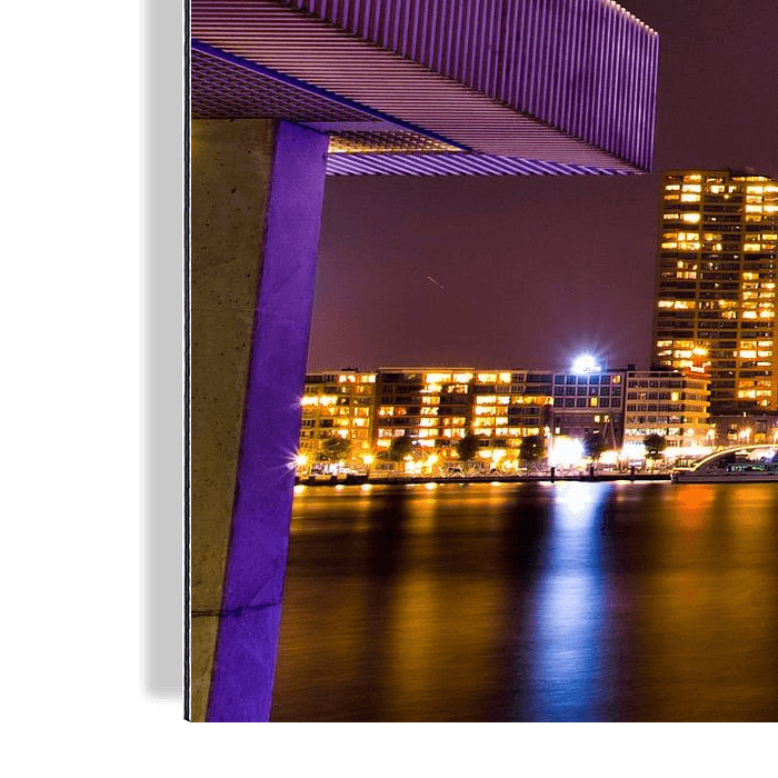 De Erasmusbrug gefotografeerd aan de zuidkant van de Maas. Door de lange sluitertijd en kleine diafragma geeft deze foto een apart lichtspel.