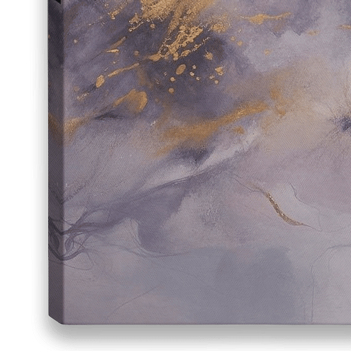 Ethereum - Cette peinture est un tourbillon abstrait de tons violets et gris doux avec des accents dorés accrocheurs qui ressortent comme des éclaboussures ou des veines luxueuses, donnant une impression de mouvement et de profondeur. Il s'agit d'une danse éthérée de couleurs et de lumière, qui confère une ambiance à la fois douce et…