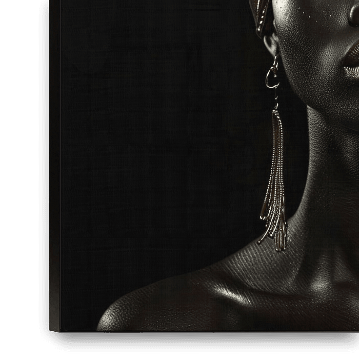 Cette photographie époustouflante capture l'essence de l'élégance et de la grâce africaines. Avec des accents dorés qui brillent sur les lèvres, les yeux et les bijoux, le modèle se présente comme une déesse. La combinaison du noir profond et de l'or brillant crée un contraste fascinant qui souligne la beauté naturelle et la dignité de…