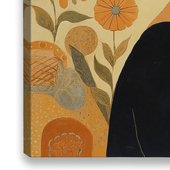 Détails : femme, fleurs, abstrait, orange, tons de terre, moderne, art, portrait, peinture de femme, femmes Couleurs : orange, jaune, noir, marron, beige, or