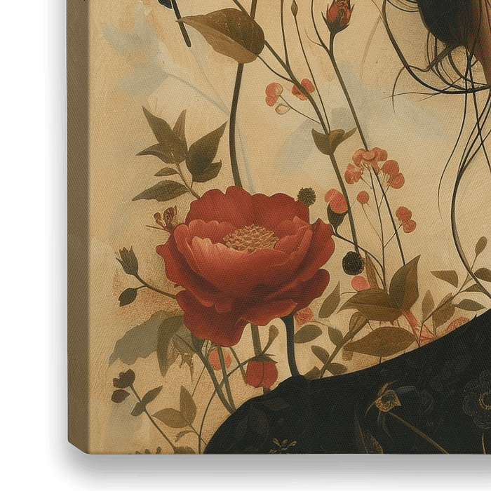Femmes - Chuchotements de fleurs - Ce tableau pour femmes représente une jeune femme au regard enchanteur et aux subtiles taches de rousseur, qui semble regarder directement dans les yeux du spectateur. Ses beaux yeux verts sont encadrés par de longs cils foncés et ses cheveux, noirs et légèrement bouclés, sont élégamment coiffés de petites tresses qui courent le long de sa tête. Ses vêtements sont noirs et ornés de délicates broderies dorées représentant des fleurs et des vrilles, ce qui lui confère une allure aristocratique. Autour de la femme, une composition exubérante de fleurs telles que des roses, des coquelicots et d'autres fleurs sauvages dans des tons de rouge, de rose et de beige. L'arrière-plan est d'un beige doux et délavé et ressemble à un vieux parchemin où des feuilles et des fleurs aux couleurs tranquilles ont été ajoutées ici et là. Des papillons noirs semblent flotter autour d'elle, donnant à l'image une atmosphère onirique, presque féerique. Cette peinture de femme oscille entre réalisme et magie, presque intemporelle.