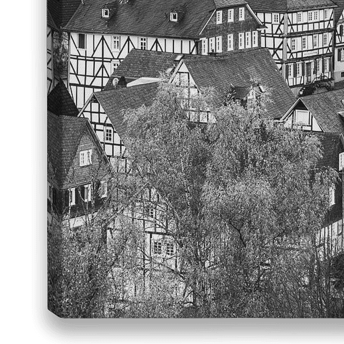 Panorama atmosphérique en noir et blanc au format 2:1 de la ville historique de Freudenberg, en Rhénanie-du-Nord-Westphalie (Allemagne), avec ses maisons à colombages caractéristiques qui se détachent sur les collines comme une mosaïque.