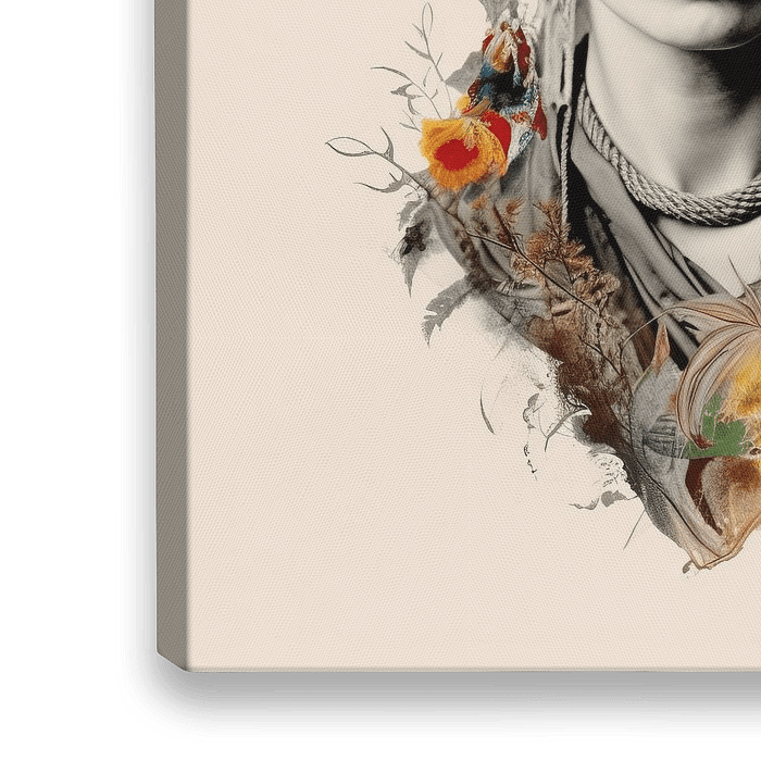 Ce portrait artistique de Frida lui donne vie dans un jeu de noir et blanc et de couleurs. Les tons noirs et blancs soulignent sa forte présence, tandis que les touches colorées de sa robe traditionnelle et de sa guirlande célèbrent son héritage mexicain et sa personnalité dynamique.