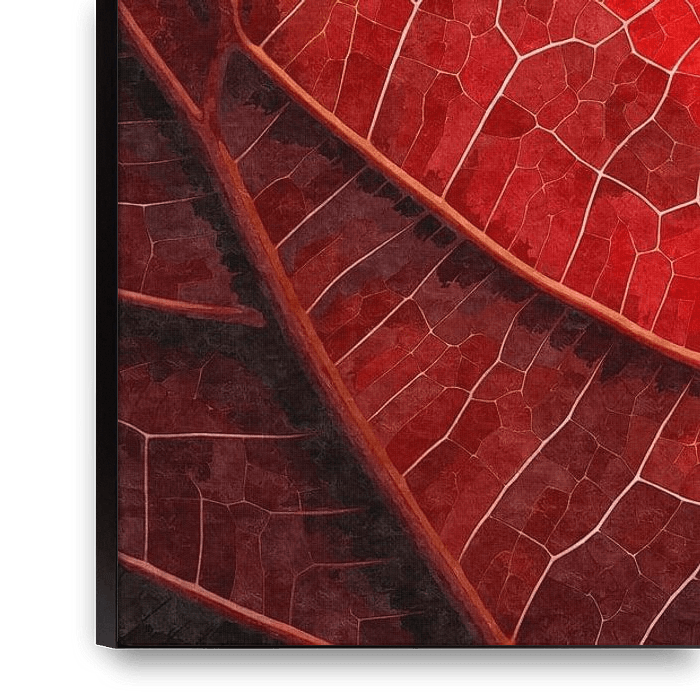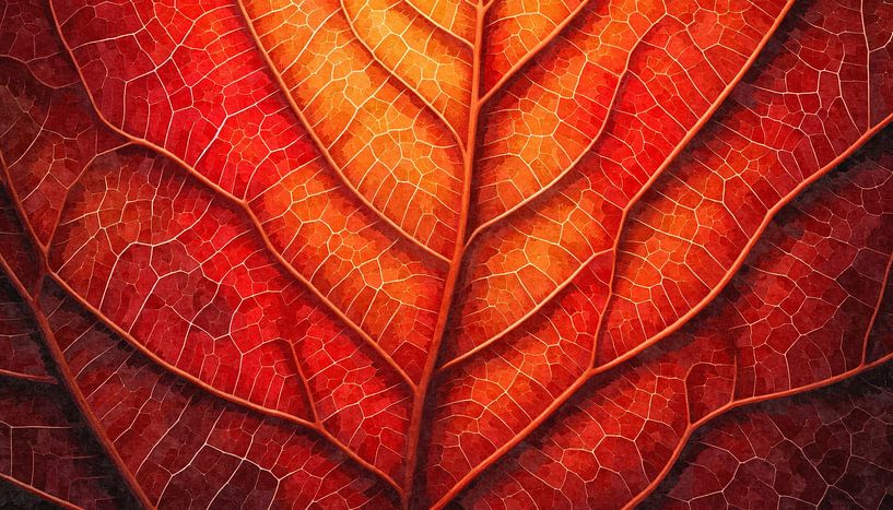 Une feuille d'automne aux couleurs vives avec un réseau de veines remarquable en rouge, orange et jaune. Les nervures centrales et latérales de la feuille forment un motif symétrique qui illustre de manière impressionnante la géométrie naturelle.