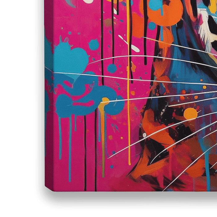 Pop Art Jaguar - Cette œuvre d'art vibrante représente un portrait coloré d'un jaguar, exécuté avec un mélange d'éléments réalistes et abstraits. Sur fond de rose fluorescent, les éclaboussures de peinture dynamiques et les couleurs vives rehaussent l'apparence puissante de l'animal.