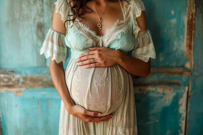 Jeune femme tenant son ventre de femme enceinte sur un Mur Bleu