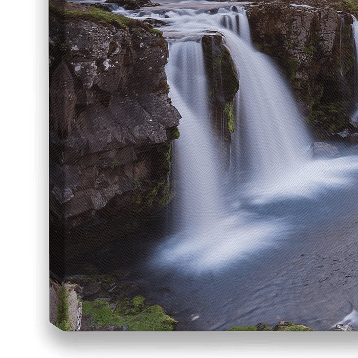 Cascade de Kirkjufellsfoss en Islande, prise au coucher du soleil en pleine nuit d'été avec une vitesse d'obturation longue.