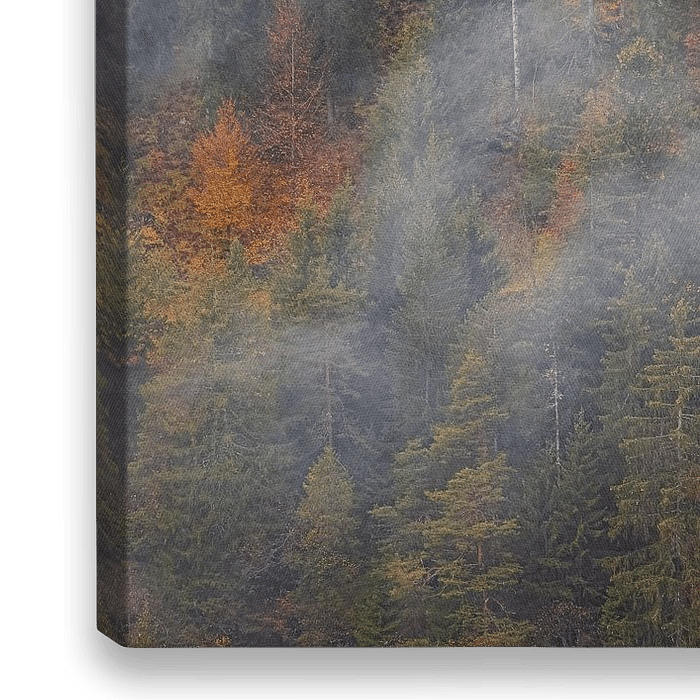 Des nuages bas et du brouillard s'accrochent aux montagnes et aux forêts aux couleurs d'automne d'octobre entre Cortina d'Ampezzo et San Vito di Cadore, dans la province italienne de Belluno, dans les Dolomites, en Italie.