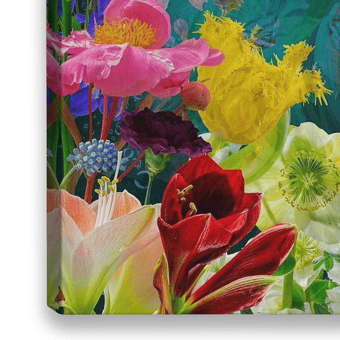 Collage photo horizontal allongé d'une mer de fleurs et de papillons qui semblent sortir de l'œil du cyclone ou être aspirés comme les papillons. Vous voyez des chrysanthèmes, des roses, des amaryllis, des hibiscus et des fleurs de pommier.