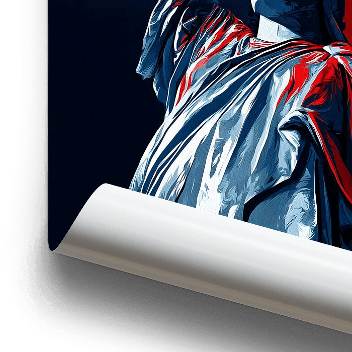 Le tableau représente la Statue de la Liberté comme un symbole emblématique, mis en scène avec force dans un style pop art. La statue se dresse avec des contrastes blancs sur un fond de bleu foncé et de rouge vif - des couleurs qui ne rappellent pas seulement le drapeau américain, mais qui symbolisent aussi la liberté, l'espoir et la…