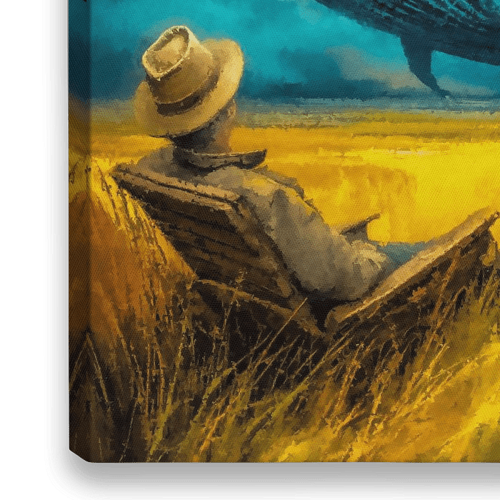 Un homme est tranquillement assis au milieu d'un champ doré tandis qu'une baleine majestueuse traverse le ciel - un motif qui défie la réalité mais qui touche profondément. « Là où les rêves s'envolent » manifeste l'imagination comme la force la plus puissante que nous possédions. Il invite à découvrir de nouvelles perspectives et à se libérer des limites de la pensée.