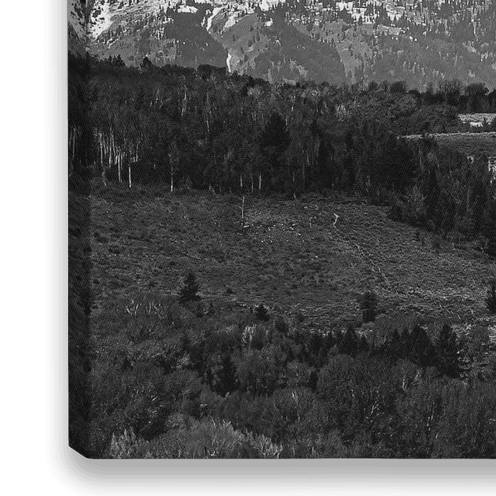 Photo 16:9 en noir et blanc surplombant les impressionnantes montagnes enneigées des Grand Tetons dans le parc national de Grand Teton, situé dans le nord-ouest de l'État du Wyoming, aux États-Unis.