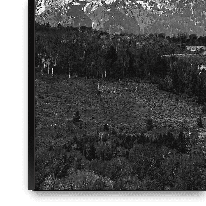 Photo 16:9 en noir et blanc surplombant les impressionnantes montagnes enneigées des Grand Tetons dans le parc national de Grand Teton, situé dans le nord-ouest de l'État du Wyoming, aux États-Unis.