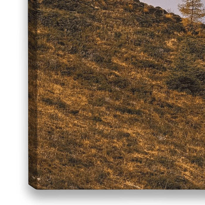 Une photo 16:9 d'un lever de soleil automnal avec de nombreuses couleurs d'automne et des pics montagneux enneigés recevant les premiers rayons du soleil de la journée.