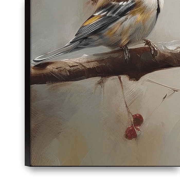 Mésanges - Cette charmante peinture capture l'essence sereine d'une rangée de mésanges gazouillantes sur une branche avec des détails subtils de baies brun-rouge. L'arrière-plan doux et neutre met l'accent sur le plumage vibrant des oiseaux, avec ses teintes jaunes, noires et blanches, créant une scène apaisante mais vibrante. L'artiste joue sur les contrastes entre le clair et le foncé pour donner de la profondeur à l'œuvre.