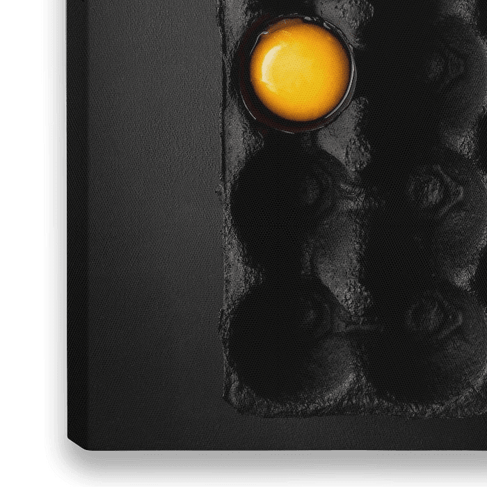 Un seul jaune d'œuf dans une boîte à œufs noire sur fond noir. Photographie alimentaire minimaliste d'un jaune d'œuf jaune et brillant.