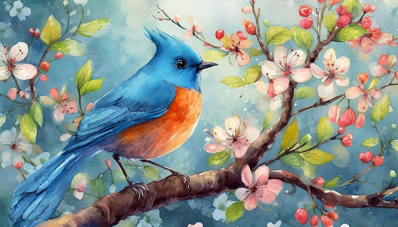 Oiseau bleu sur une branche au printemps, Design d'art