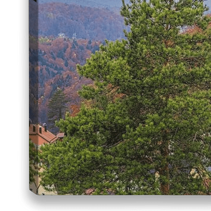 La photo montre le village pittoresque niché dans une vallée colorée avec des feuilles d'automne vibrantes, des bâtiments historiques et des nuages dramatiques…