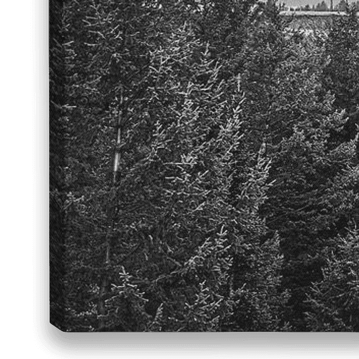 Large image panoramique en noir et blanc d'un lever de soleil avec une couche de brume sur la Snake River vue depuis le Snake River Overlook avec en arrière-plan la vue sur les montagnes du parc national de Grand Teton, un massif situé au nord-ouest du Wyoming, États-Unis.