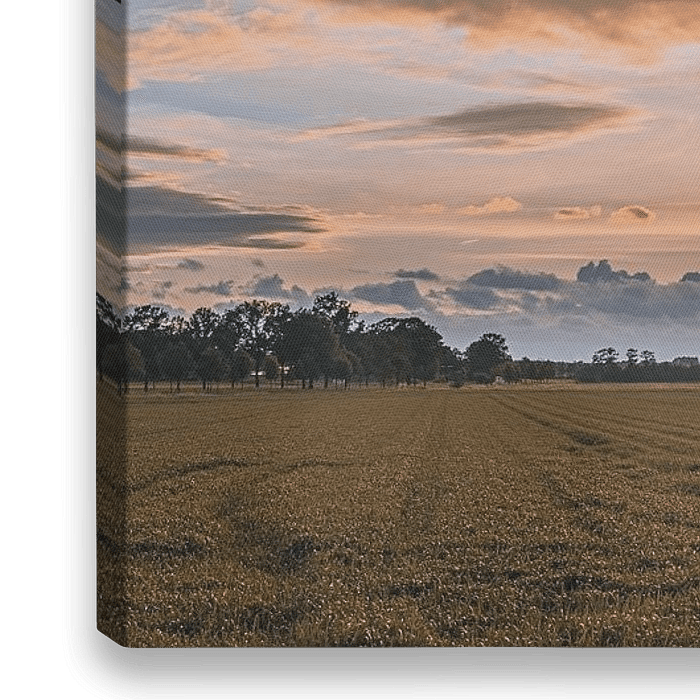 Image panoramique 2:1 d'un coucher de soleil avec des nuages rougeoyants sur le monument "Notre-Dame de la Betuwe en fleurs" à Bemmel (commune de Lingewaard), une chapelle de la Vierge Marie construite en briques.