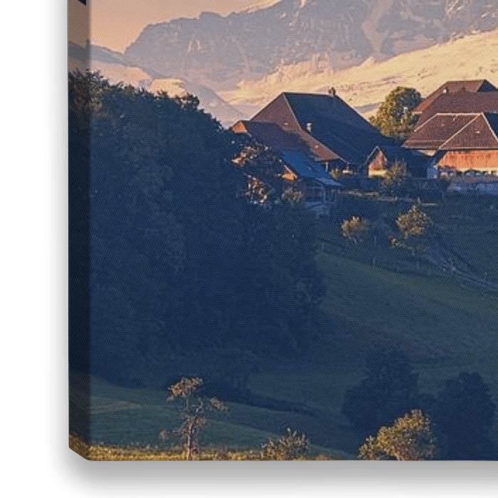 Image panoramique 3:1 d'un matin d'été brumeux au lever du soleil dans l'Emmental, une vallée de Suisse centrale, dans le canton de Berne, surplombant les Alpes suisses enneigées de l'Oberland bernois.