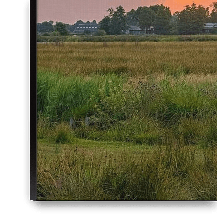 Photo panoramique 3:1 d'un lever de soleil estival à Windmotor Oudega, un moulin de polder dans la réserve naturelle De Alde Feanen près du village frison d'Oudega, situé dans la municipalité néerlandaise de Smallingerland. Il s'agit d'un moulin à vent américain de taille moyenne, sans broyage, de la marque Herkules. Il possède une roue…