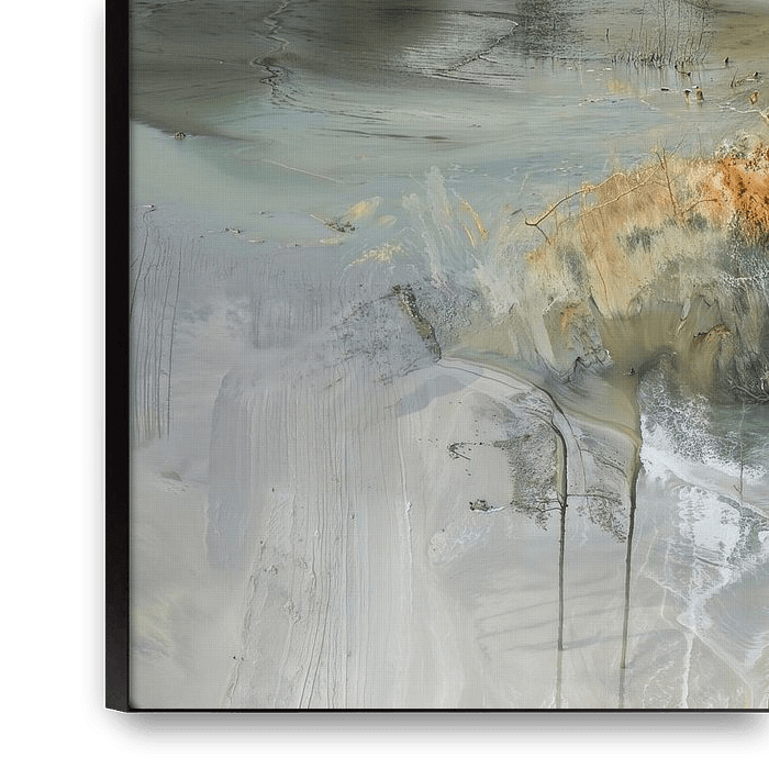 Tableau de femme Mer | Sérénité au bord de la mer - Ce tableau de femme montre une femme élégante, vue de dos, contemplant une vaste mer depuis une haute falaise. La femme porte une robe fluide qui semble se fondre dans la nature sauvage qui l'entoure, des éléments de la flore se confondant avec le tissu de sa robe. Le style de la peinture est expressif et quelque peu abstrait, les détails de l'environnement et de la robe semblant se fondre dans de larges coups de pinceau dynamiques. Les couleurs blanc, beige, turquoise et diverses nuances de brun dominent la peinture, tandis que des éclaboussures d'orange et de vert foncé ajoutent de la profondeur et du contraste. Les oiseaux de mer, peints en lignes douces, presque éthérées, ajoutent un sentiment de mouvement et de liberté au tableau.