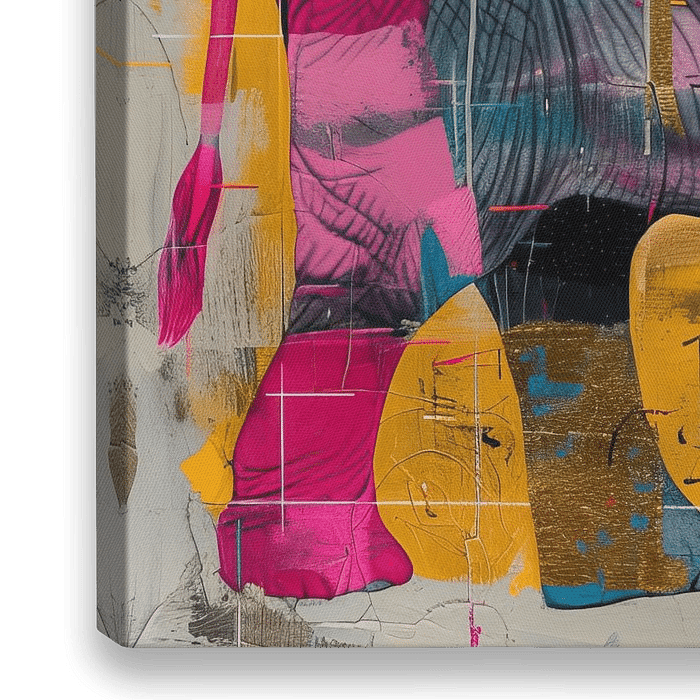 Couleurs : rose, jaune, bleu, noir, blanc, gris