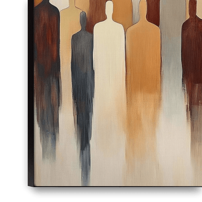 Personnes abstraites - Cette peinture abstraite de personnes montre un groupe de figures stylisées et anonymes dans des tons de terre doux et débordants qui passent du sombre en bas à la lumière en haut, créant un sentiment de masse et de mystère.