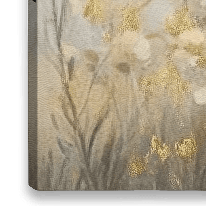Détails : peinture abstraite, champ de fleurs, art moderne, touches d'or, nature, prairie fleurie, art sur toile, décoration murale, décoration d'intérieur, art apaisant Couleurs : beige, or, pastel