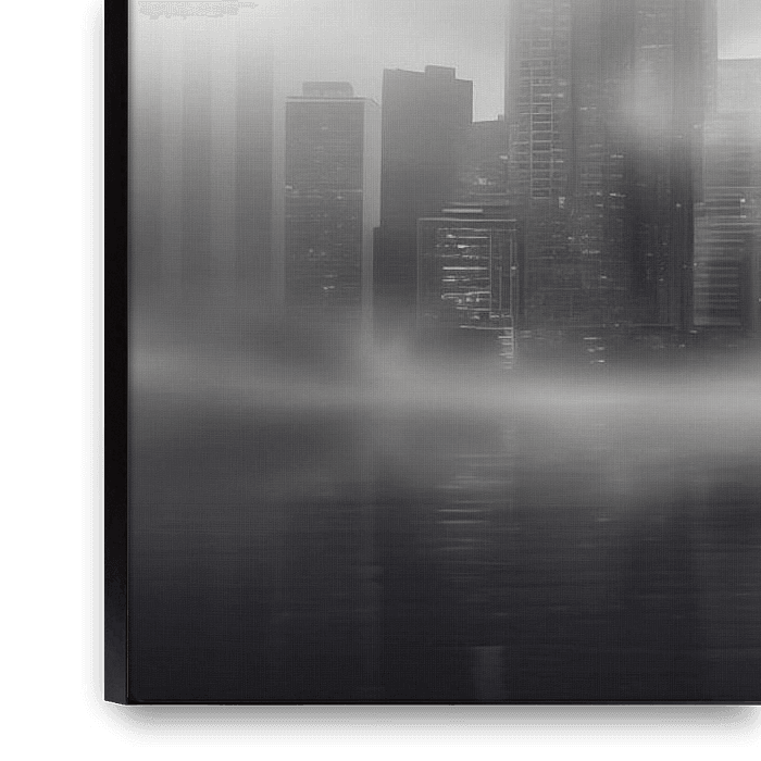 Photo en noir et blanc d'une silhouette de ville dans le brouillard avec des gratte-ciel, design artistique