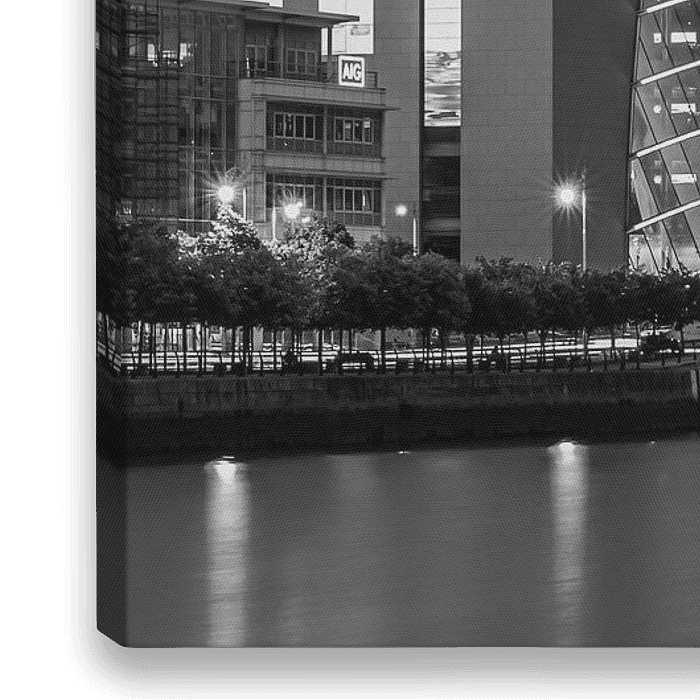 Photographie en noir et blanc d'une soirée au pont Samuel Beckett, un pont à haubans sur la rivière Liffey dans la zone portuaire de Dublin, en Irlande. Une pièce reconnaissable de l'architecture de Santiago Calatrava.