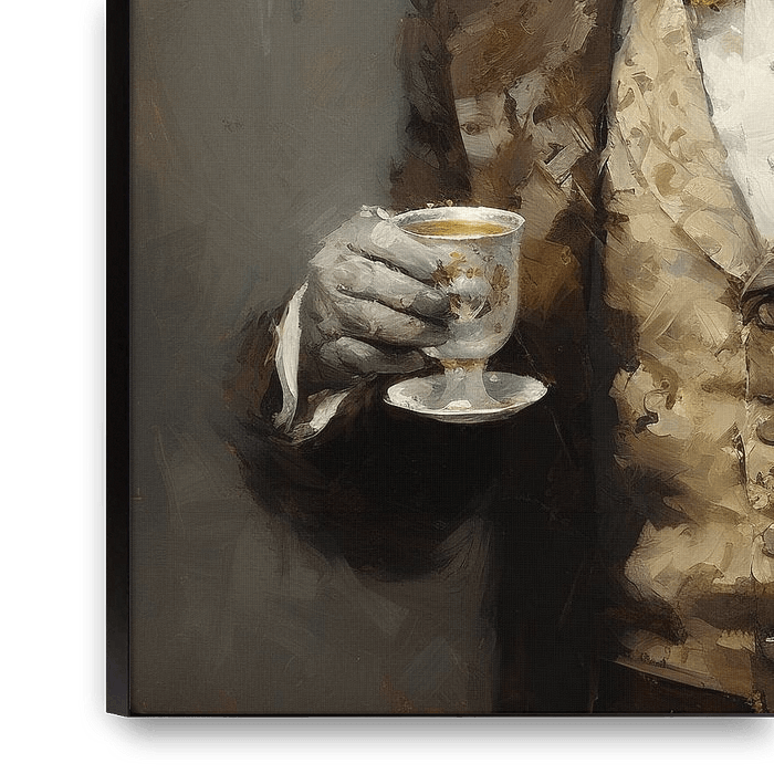 Portrait classique - Noble portrait de léopard - Voici le portrait sophistiqué d'un léopard habilement vêtu, aux traits aristocratiques et démodés évidents. Le léopard est représenté dans un costume classique avec chapeau haut-de-forme et nœud papillon, et semble même avoir un verre à la main. Les couleurs sont principalement chaudes, une palette de bruns ajoutant à l'atmosphère nostalgique, tandis que le style impressionniste de la peinture évoque une sensation intemporelle.