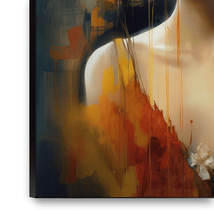 Portrait moderne avec des gouttes de peinture évasées en jaune, orange et or. Cette œuvre fait vraiment sensation !